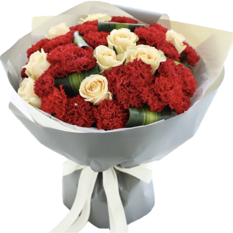 Букет состоит из 11 белых роз, 26 гвоздик, зелень, красивая упаковка, атласная лента.