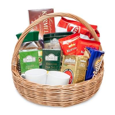 В корзину включено: кофе Якобс 190 гр, кофе молотый Lavazza 250 гр, листовой чай Ahmad 100 гр, зеленый чай Ahmad, черный чай Ahmad, круассаны 7days, вафельный торт, шоколад Корона 2шт, печенье с шоколадной начинкой, две чашки.