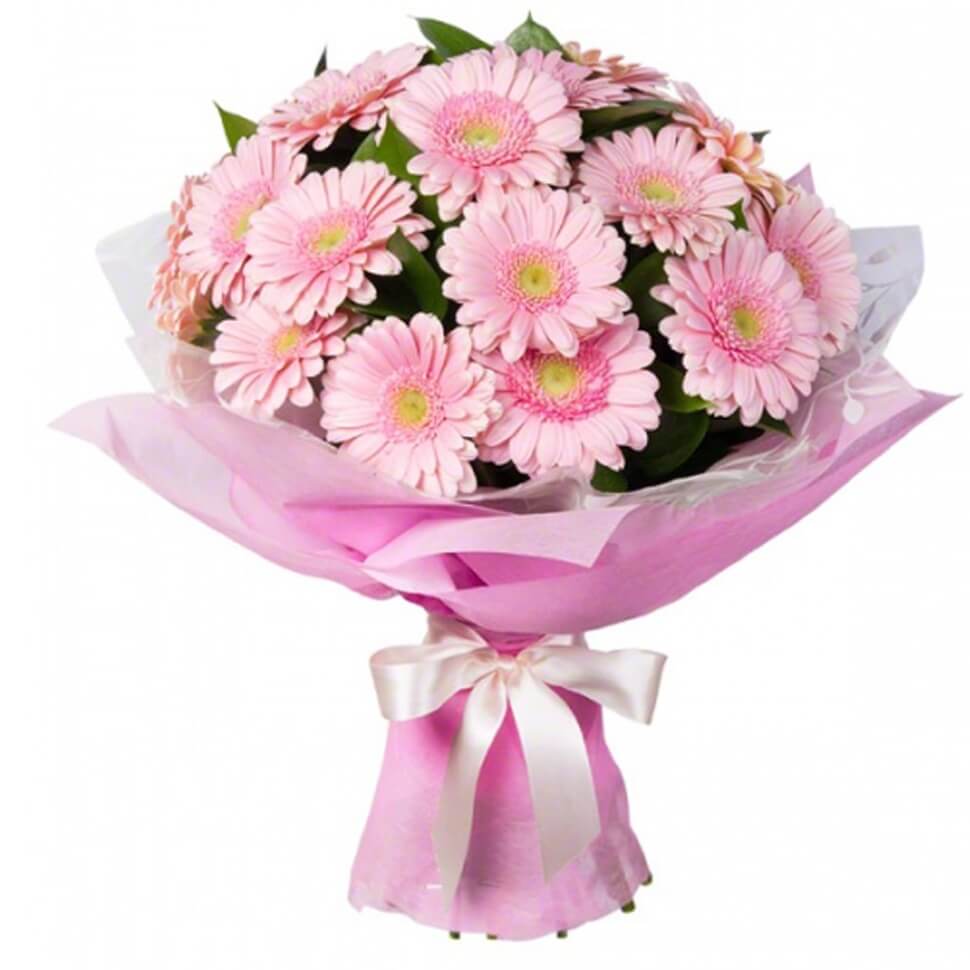 Букет состоит из 21 розовый гербер, розовая упаковка, атласная лента.