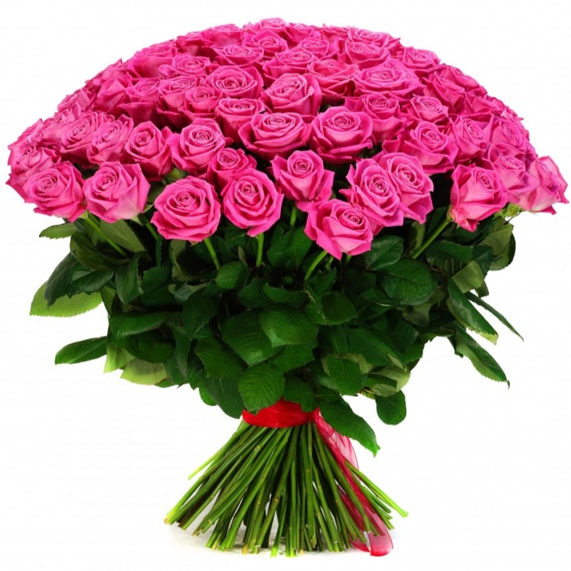 Букет состоит из 75 розовых роз, прозрачная упаковка, атласная лента.