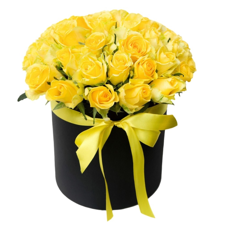 Букет состоит из 25 желтых роз, шляпная коробка, атласная лента.